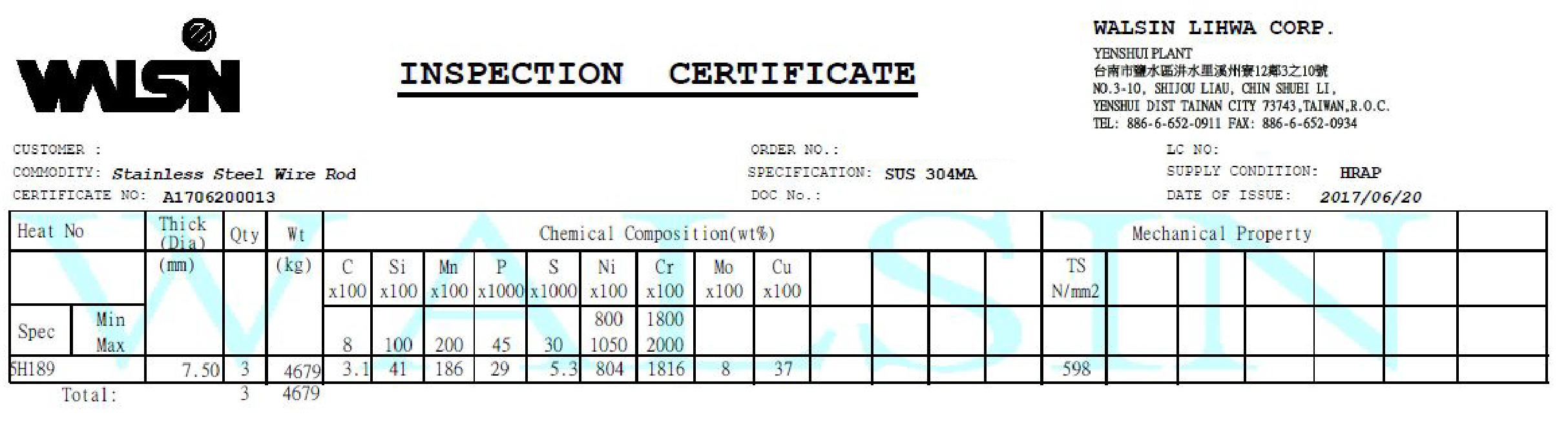 2017 年 12 月份購入 2 批材料, 2018 年 1 月生產,不鏽鋼材質證明