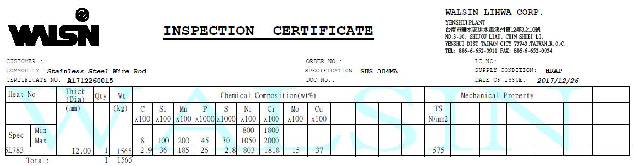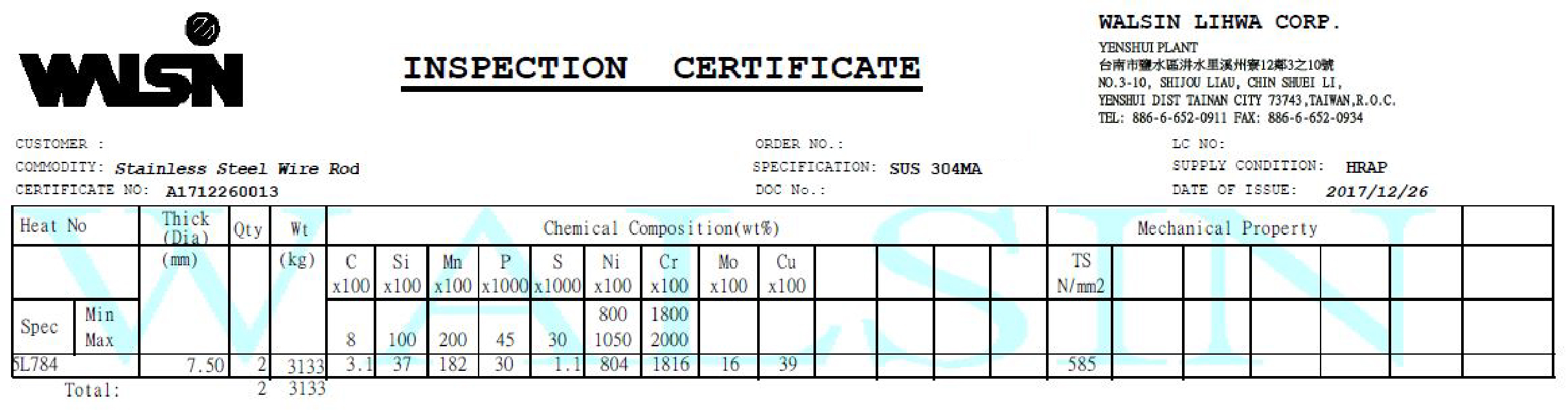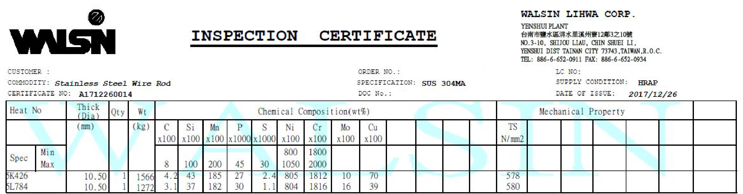2018 年 1 月份購入 4 批材料, 2018 年 2 月生產,不鏽鋼材質證明