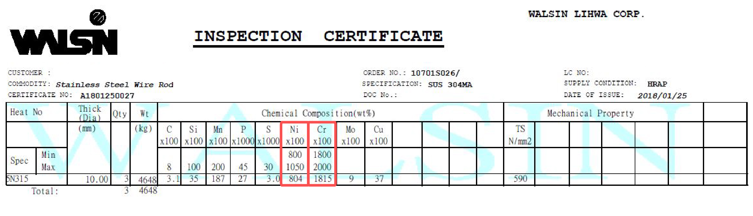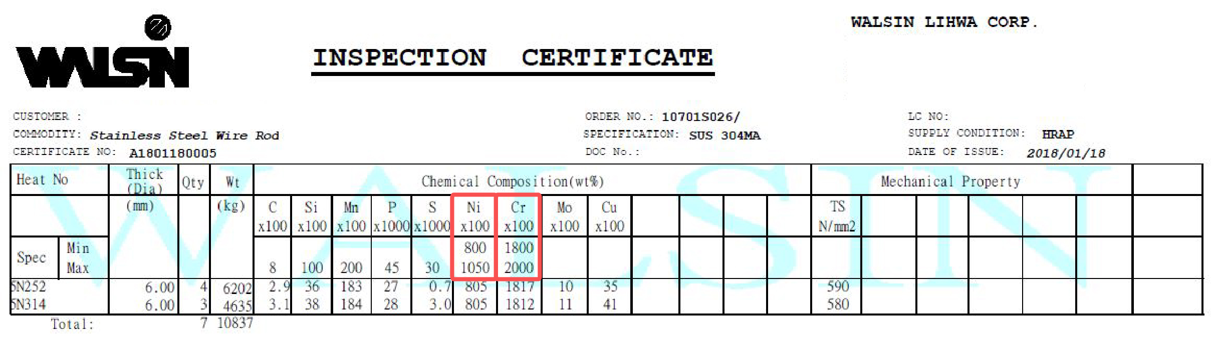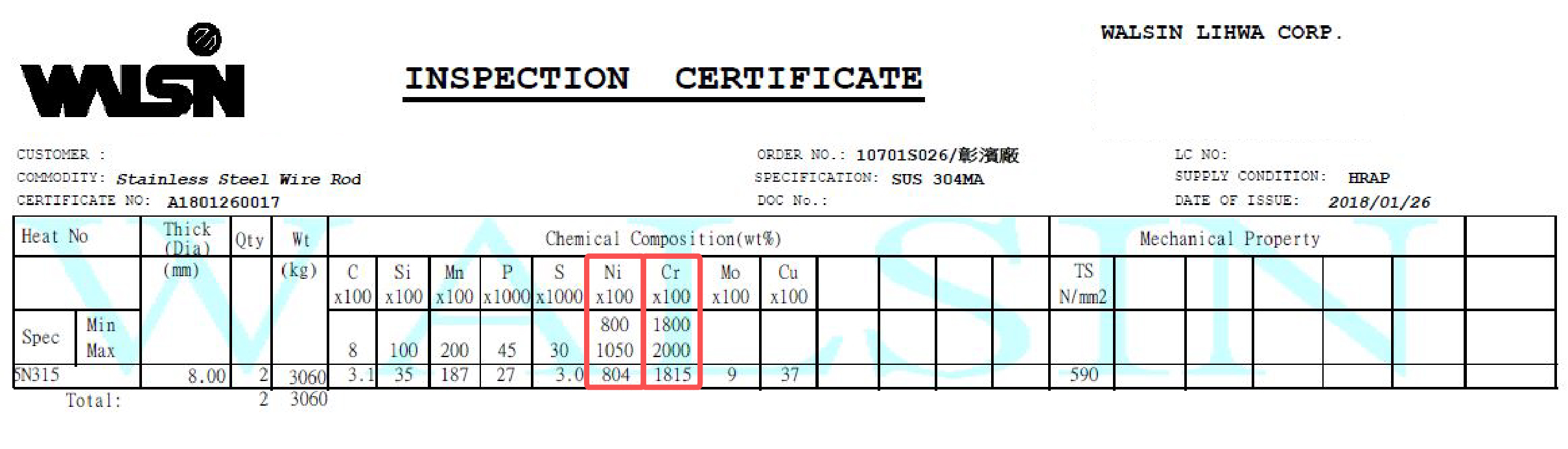 2018 年 2 月份購入 5 批材料, 2018 年 3 月生產,不鏽鋼材質證明