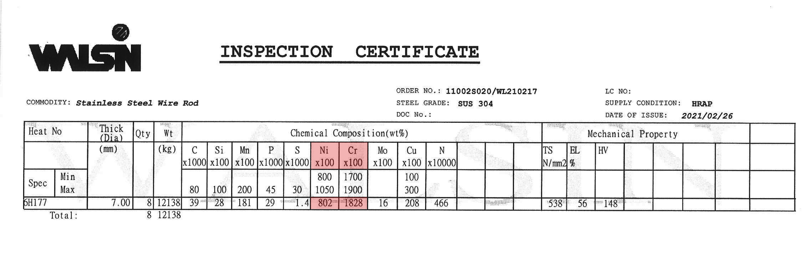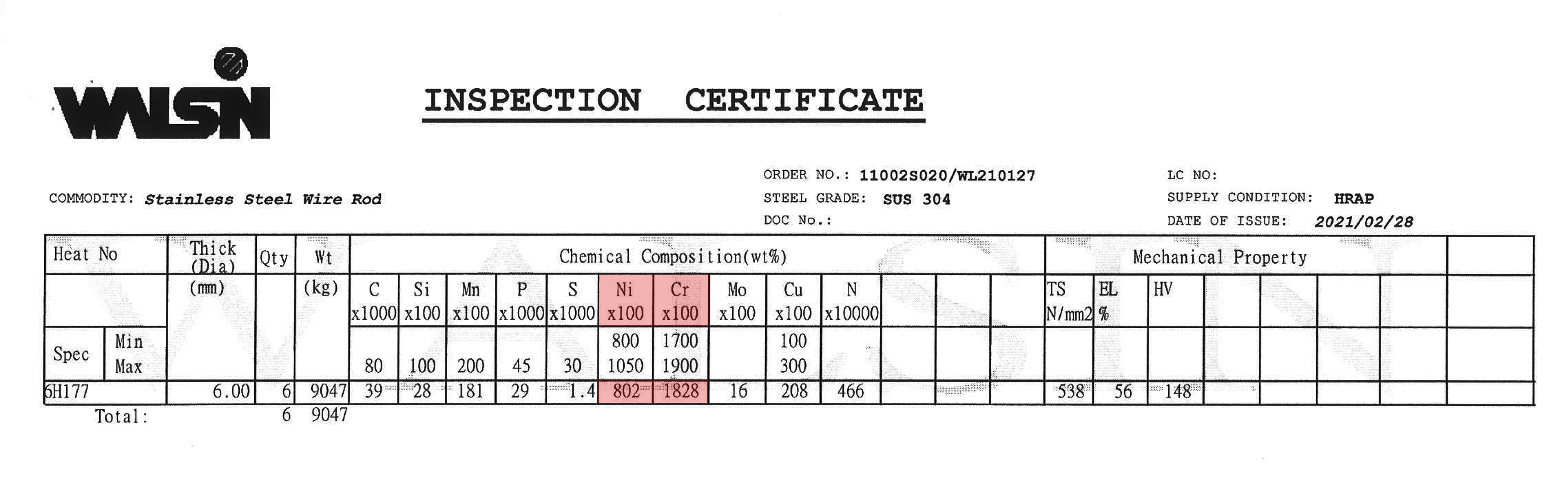 2021 年 2 月份購入材料, 2021 年 3 月生產,不鏽鋼材質證明