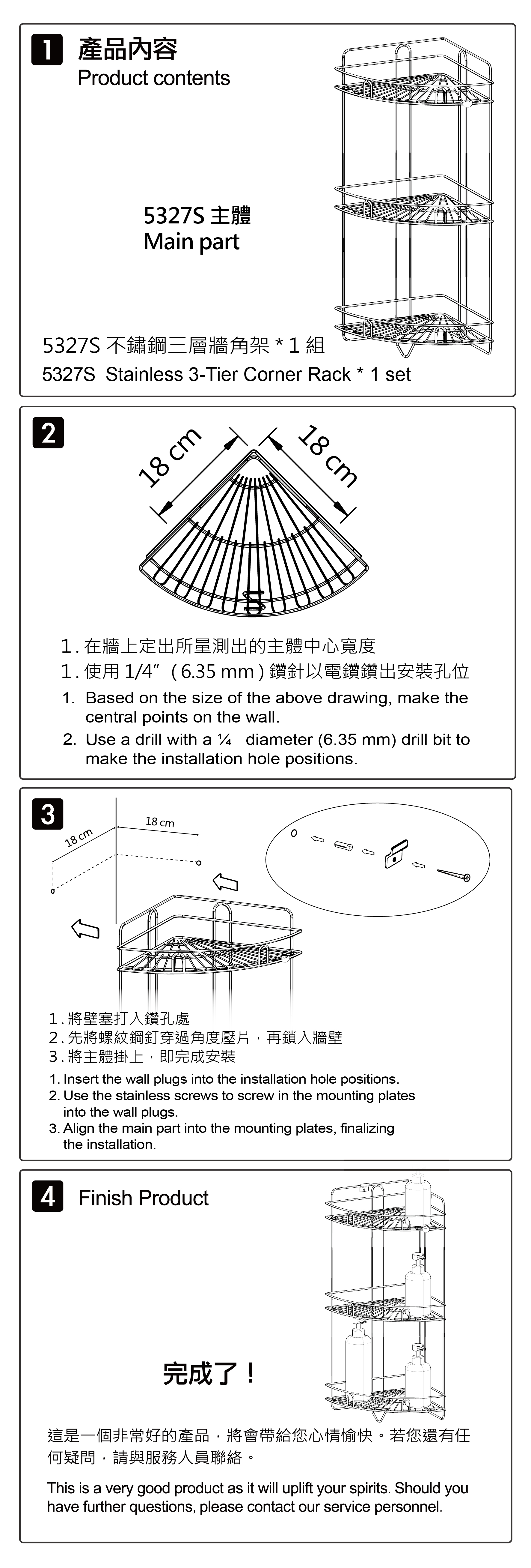 | 內部配件: | 不鏽鋼三層牆角架 * 1 、不鏽鋼壓片 * 2 、不鏽鋼螺絲 * 2 、壁塞 * 2 |