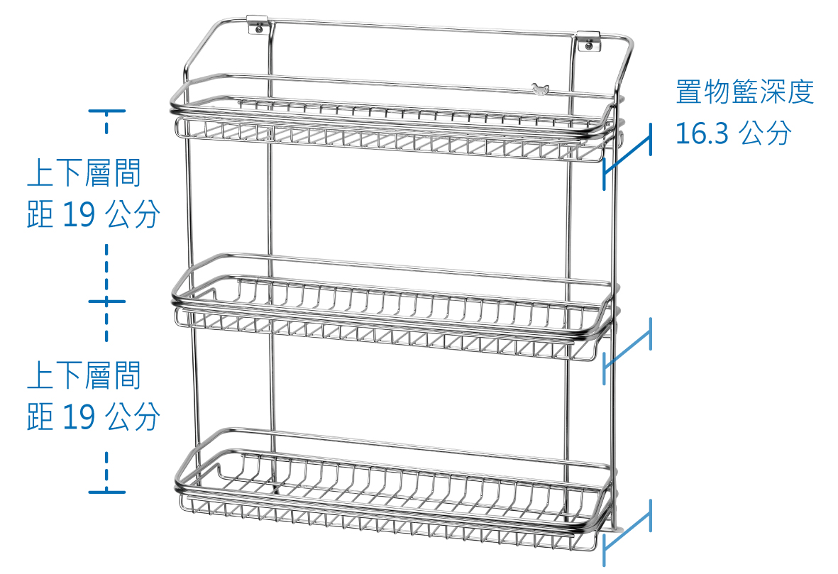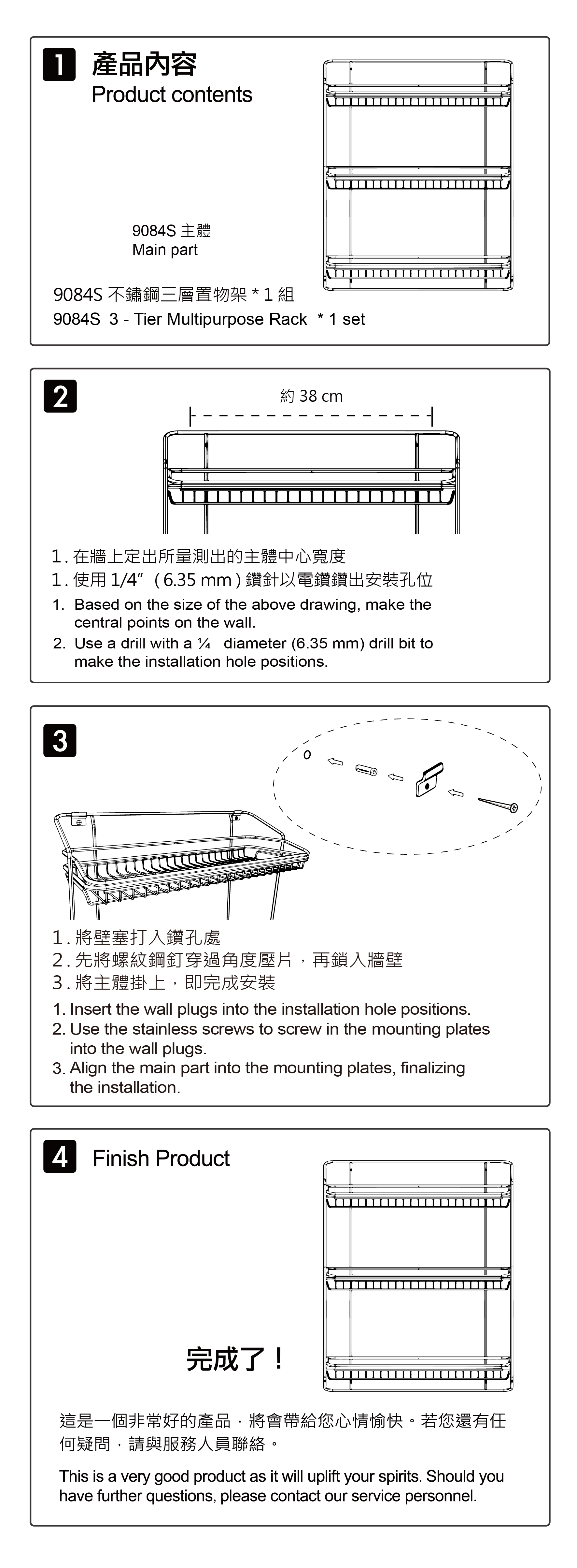 | 內部配件: | 不鏽鋼三層置物架 * 1 、不鏽鋼壓片 * 2 、不鏽鋼螺絲 * 2 、壁塞 * 2 |