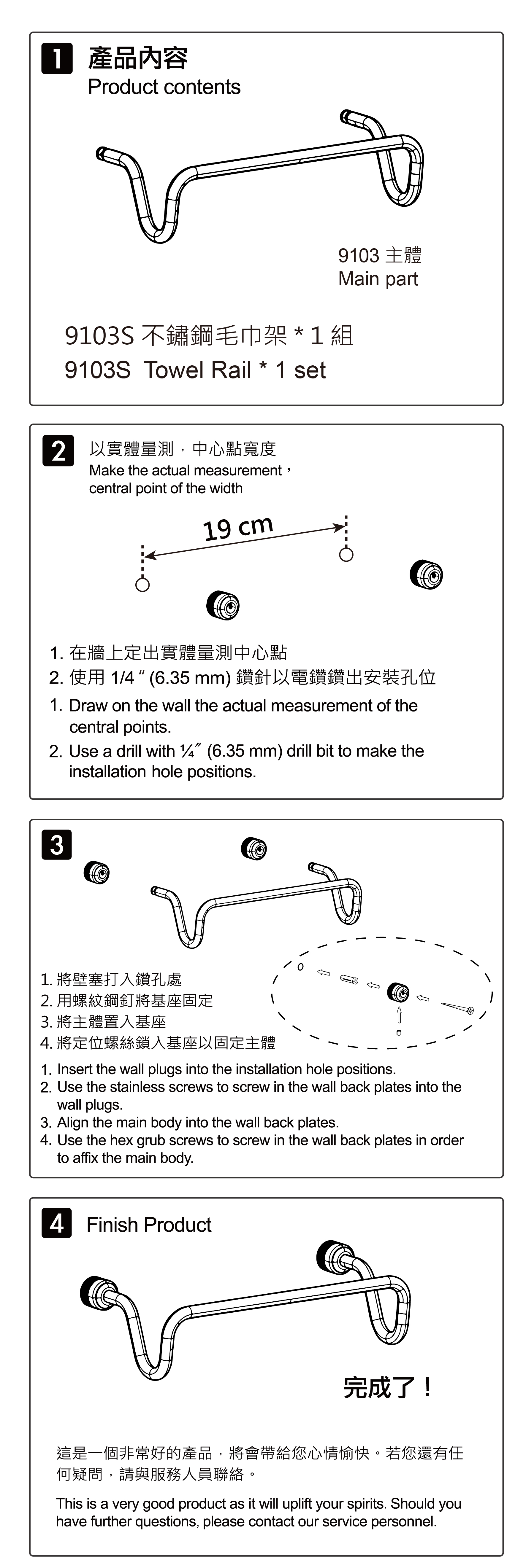 | 內部配件: | 不鏽鋼毛巾架 * 1、不鏽鋼接頭 * 2、不鏽鋼螺絲 * 2、不鏽鋼固定螺絲 * 2、壁塞 * 2、六角板手 * 1 |