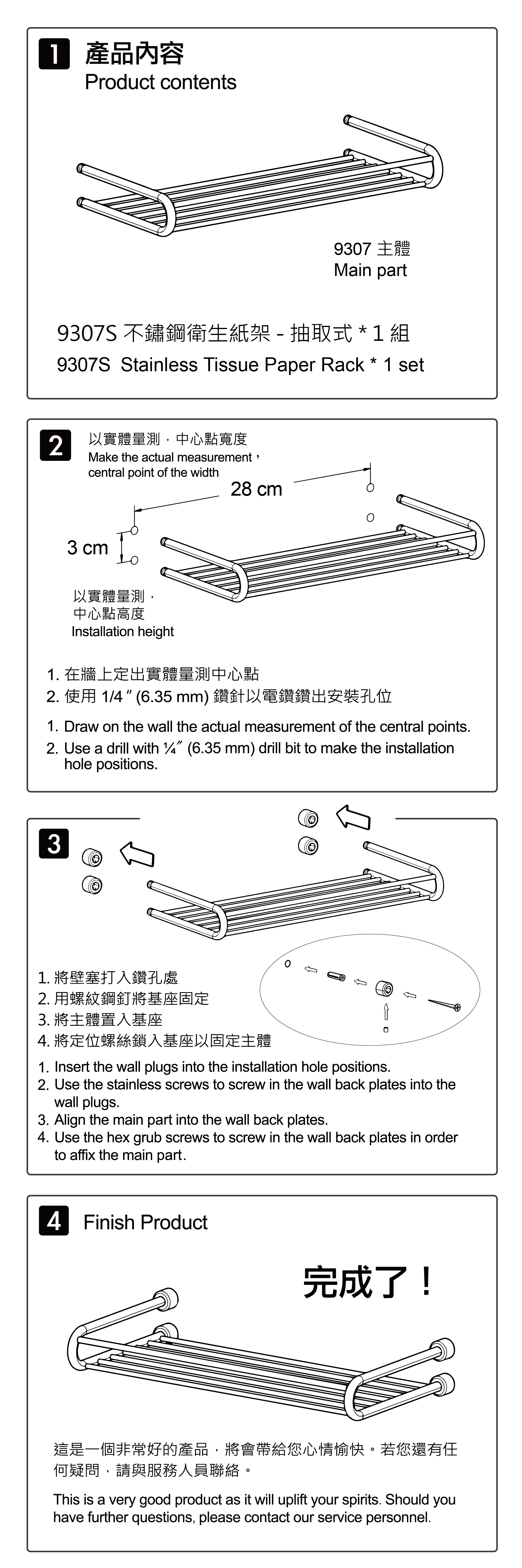 | 內部配件: | 不鏽鋼抽取式面紙架 * 1 、不鏽鋼接頭 * 4 、不鏽鋼螺絲 * 4 、不鏽鋼固定螺絲 * 4 、塑膠壁塞 * 4 、六角板手 * 1 |
