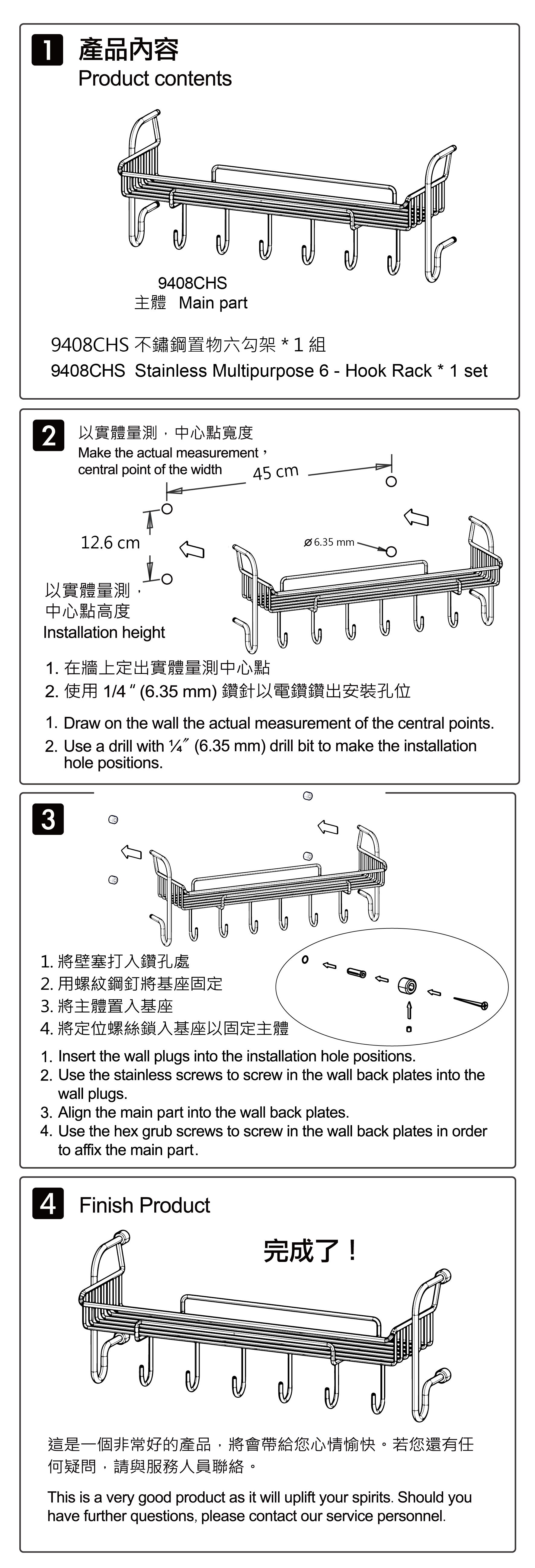 | 內部配件: | 不鏽鋼置物六勾架 * 1 、不鏽鋼接頭 * 4 、不鏽鋼螺絲 * 4 、不鏽鋼固定螺絲 * 4 、壁塞 * 4 、六角板手 * 1 |