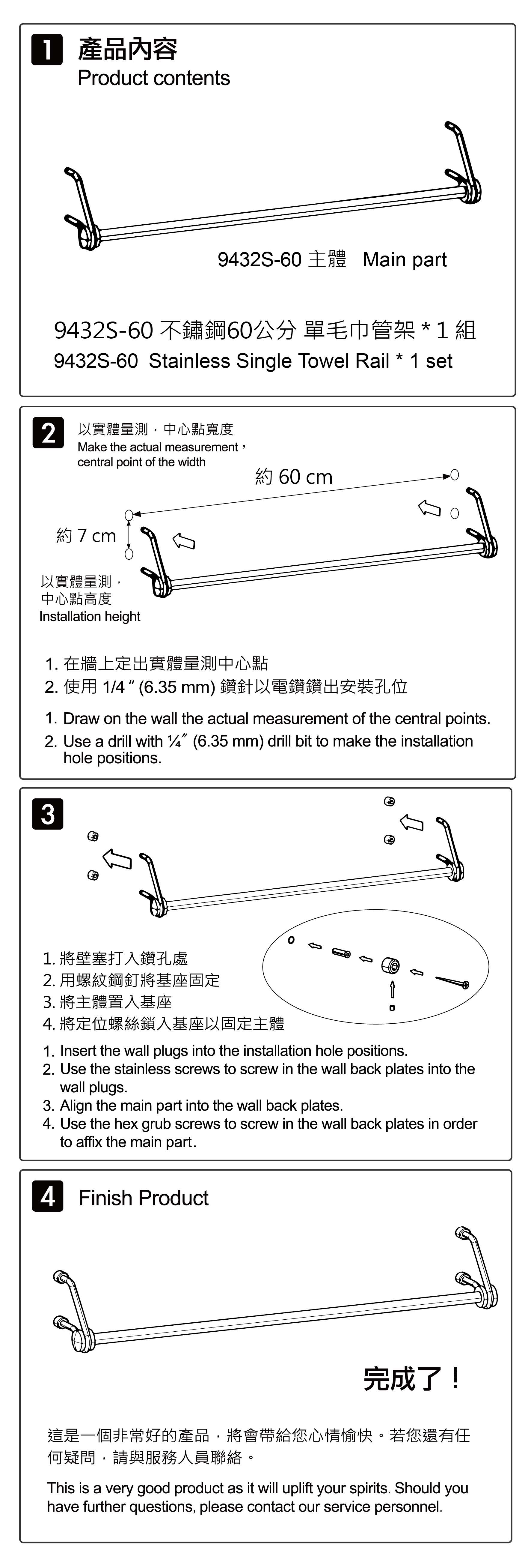 | 內部配件: | 不鏽鋼單毛巾架 * 2、不鏽鋼 60 公分圓管 * 1、不鏽鋼管座 * 2、不鏽鋼螺絲 * 4、塑膠壁塞 * 4、不鏽鋼定位螺絲 * 4、不鏽鋼基座 * 4、六角板手 * 1 |
