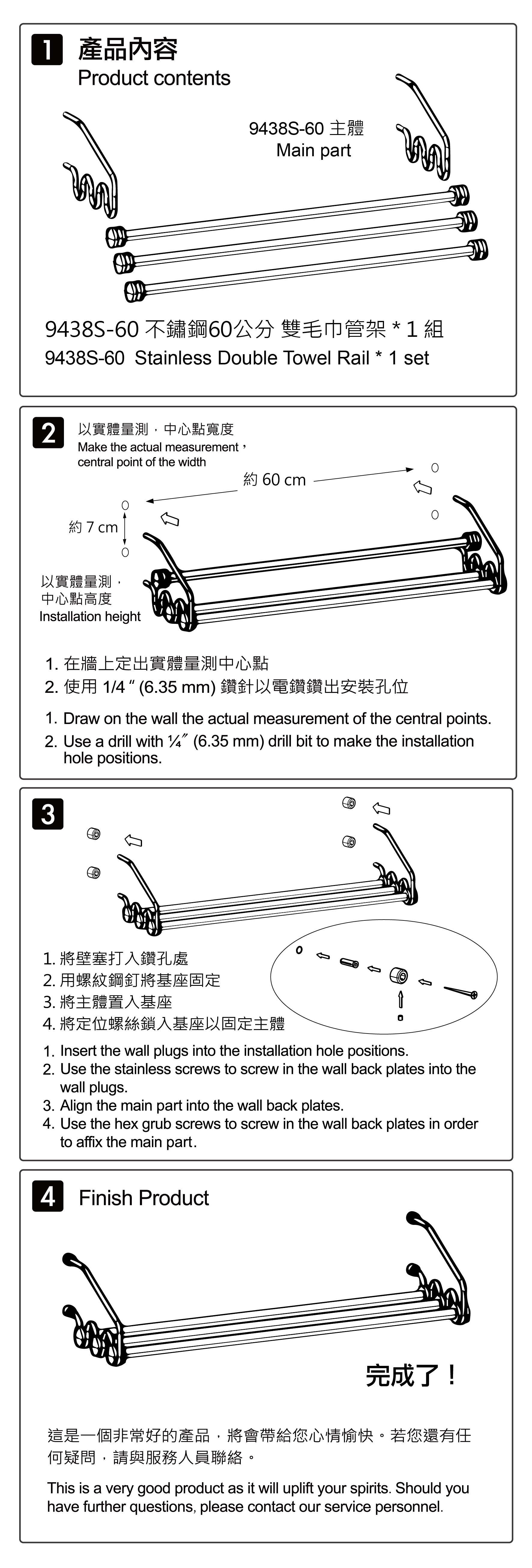 | 內部配件: | 不鏽鋼三毛巾架 * 2 、不鏽鋼 60 公分圓管 * 3 、不鏽鋼管座 * 6 、不鏽鋼螺絲 * 4 、塑膠壁塞 * 4 、不鏽鋼定位螺絲 * 4 、不鏽鋼基座 * 4 、六角板手 * 1 |