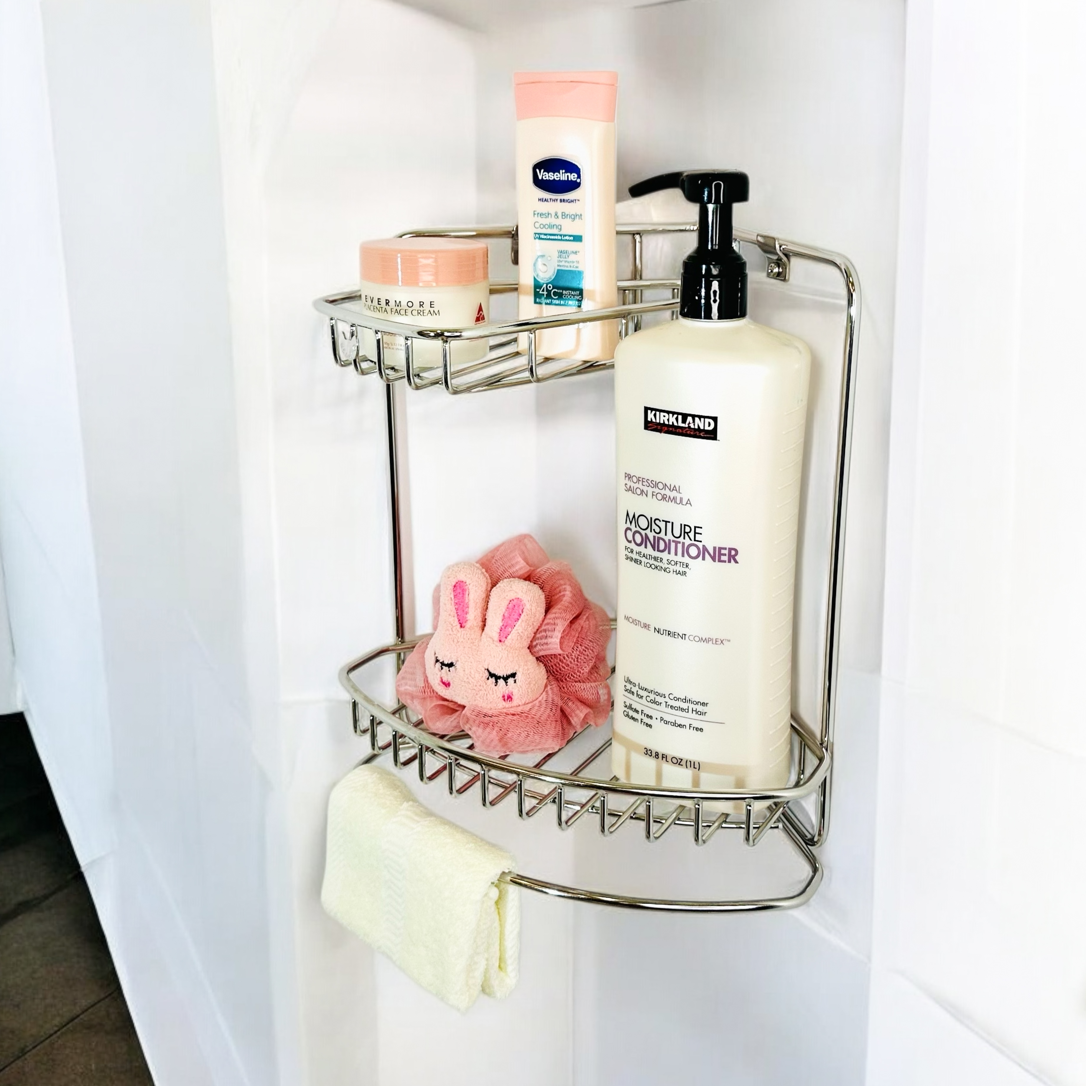 (1) 空間 安裝於最節省空間牆角位置,可置放高瓶罐沐浴乳洗髮精