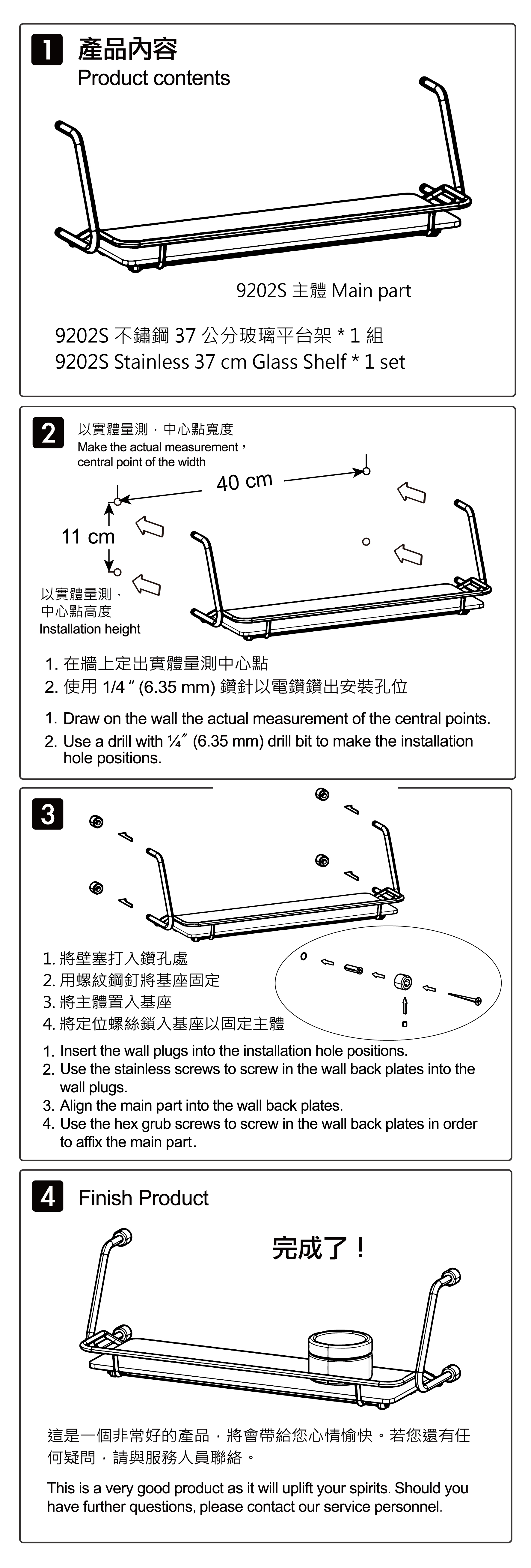 | 內部配件: | 不鏽鋼玻璃平台架 * 1、強化玻璃 * 1、不鏽鋼螺絲 * 4、塑膠壁塞 * 4、不鏽鋼定位螺絲 * 4、不鏽鋼基座 * 4、六角板手 * 1 |