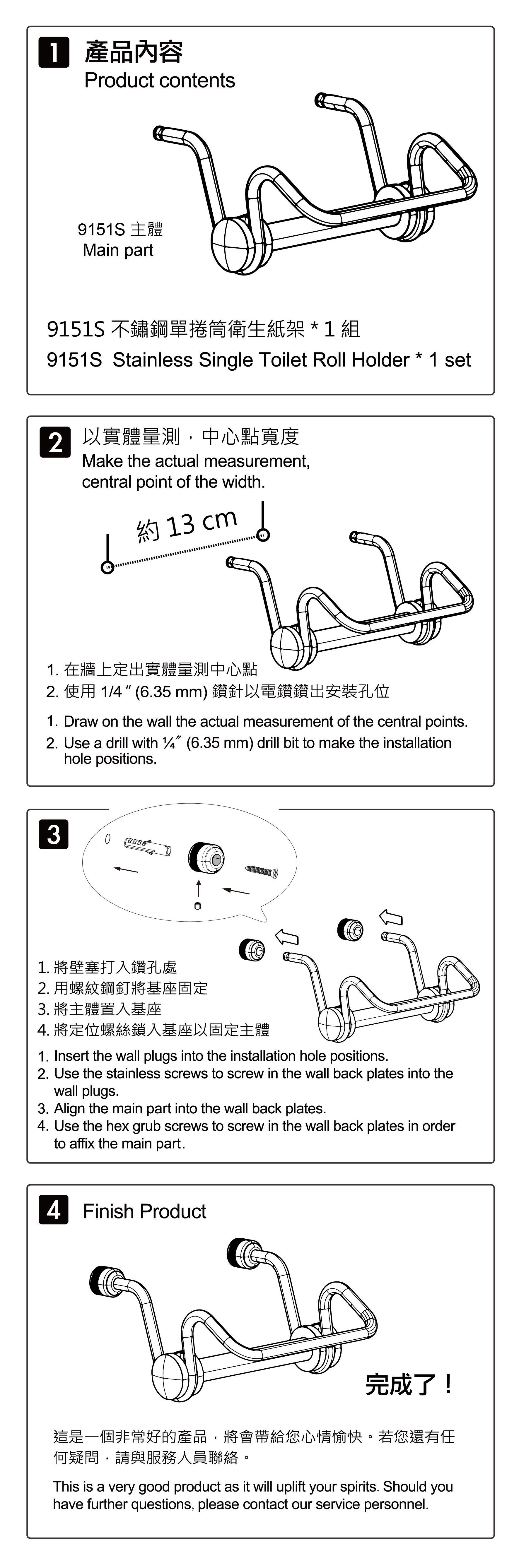 | 內部配件: | 不鏽鋼捲紙架-單捲 * 1 、不鏽鋼接頭 * 2 、不鏽鋼螺絲 * 2 、不鏽鋼固定螺絲 * 2 、壁塞 * 2 、六角板手 * 1 |