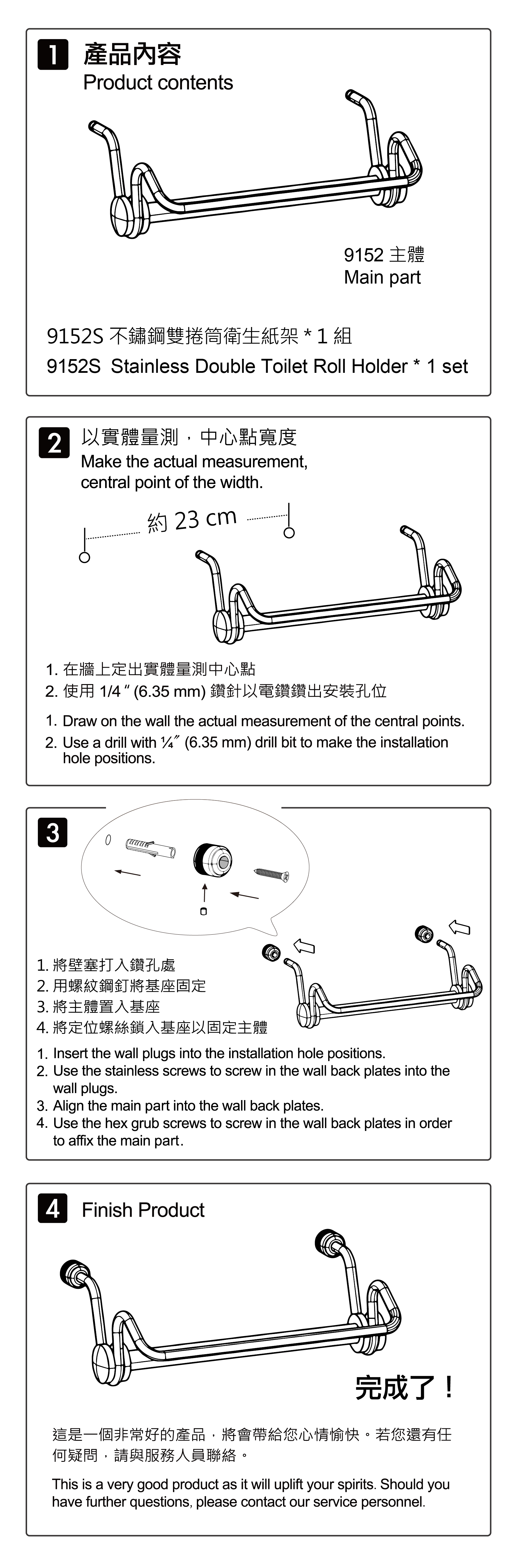 | 內部配件: | 不鏽鋼捲紙架-雙捲 * 1 、不鏽鋼接頭 * 2 、不鏽鋼螺絲 * 2 、不鏽鋼固定螺絲 * 2 、壁塞 * 2 、六角板手 * 1 |