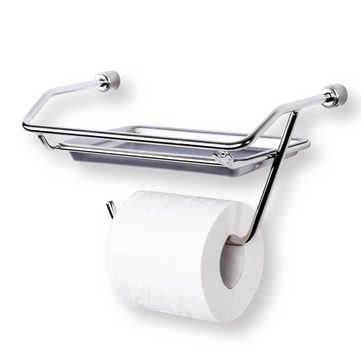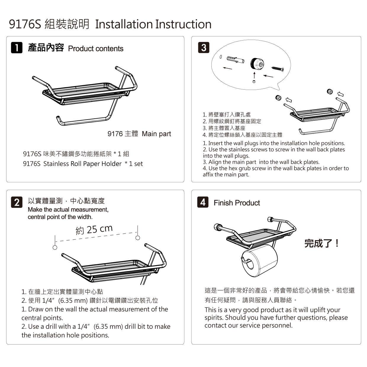 不鏽鋼多功能捲紙架* 1 、不鏽鋼盤 * 1、不鏽鋼接頭 * 2 、不鏽鋼螺絲 * 2 、不鏽鋼固定螺絲 * 2 、塑膠壁塞 * 2 、六角板手 * 1 |