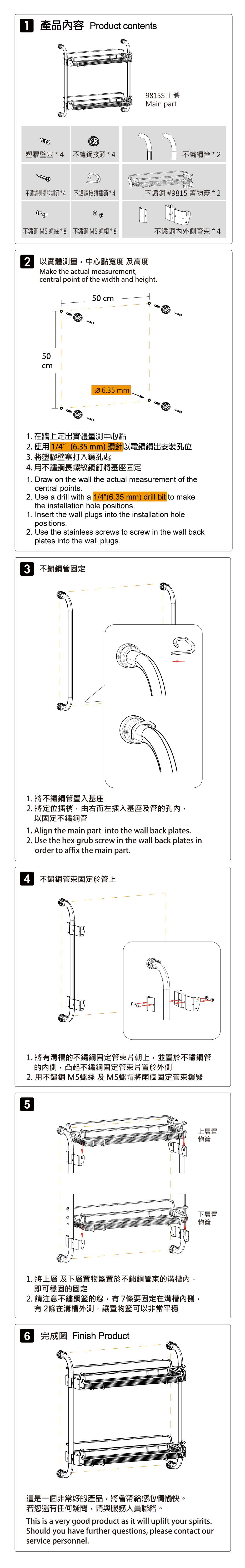 | 內部配件: | 塑膠壁塞 * 4、不鏽鋼接頭 * 4 、不鏽鋼長螺紋鋼釘 (固定牆壁) * 4、不鏽鋼管 * 2、固定管與不鏽鋼接頭插銷 * 4、不鏽鋼 M5 螺絲螺帽 * 8、不鏽鋼內外側管束 * 4、不鏽鋼 45 公分 置物籃 * 2 |