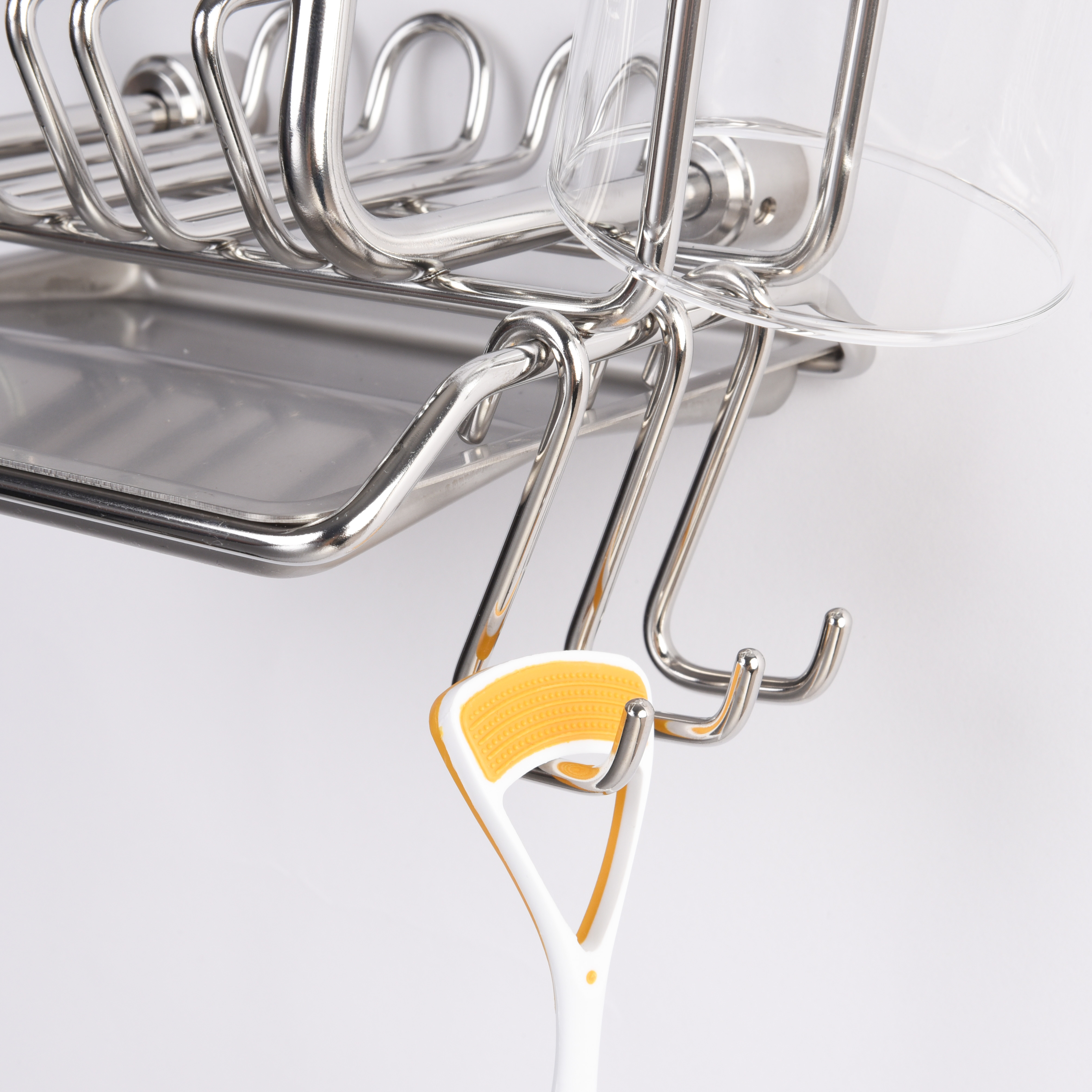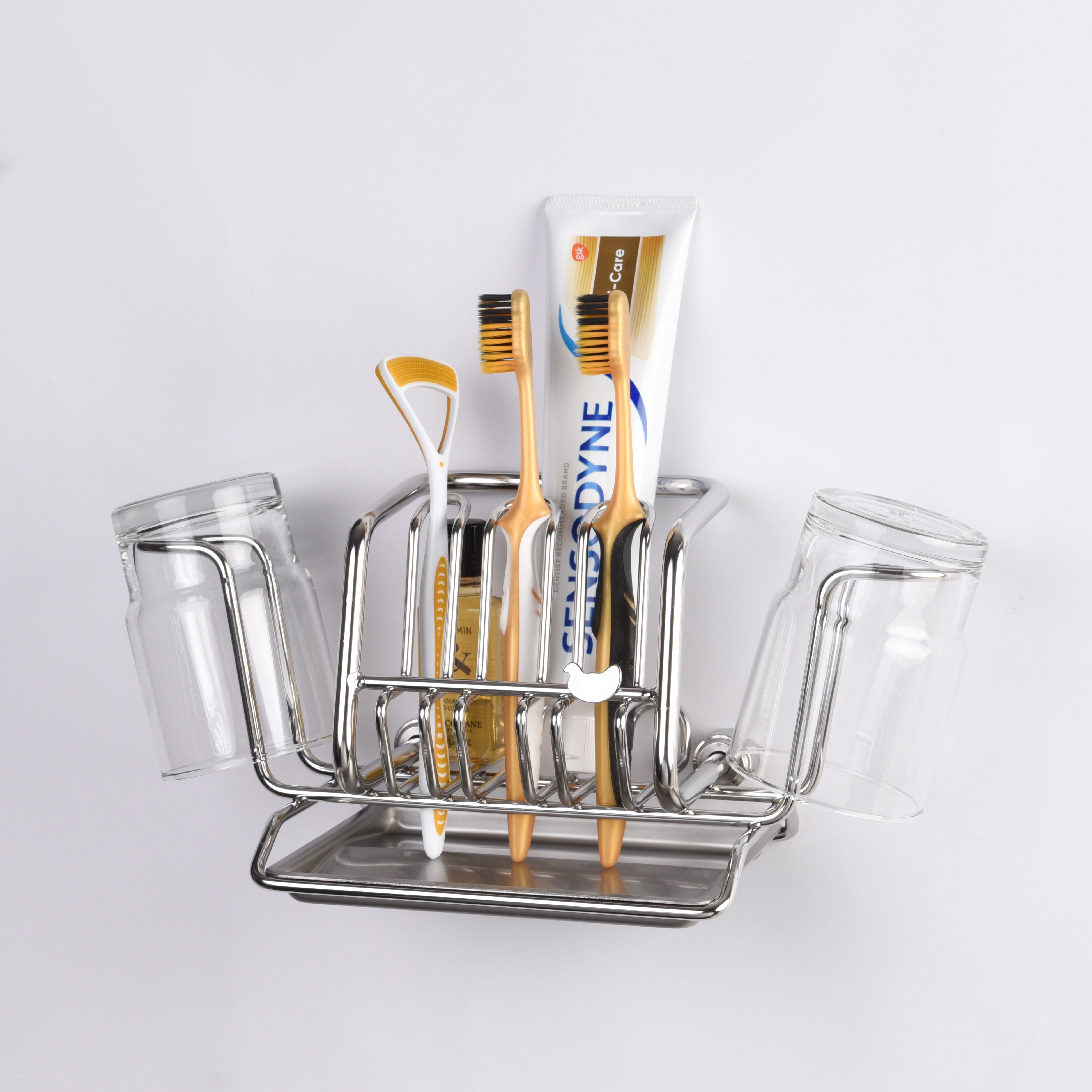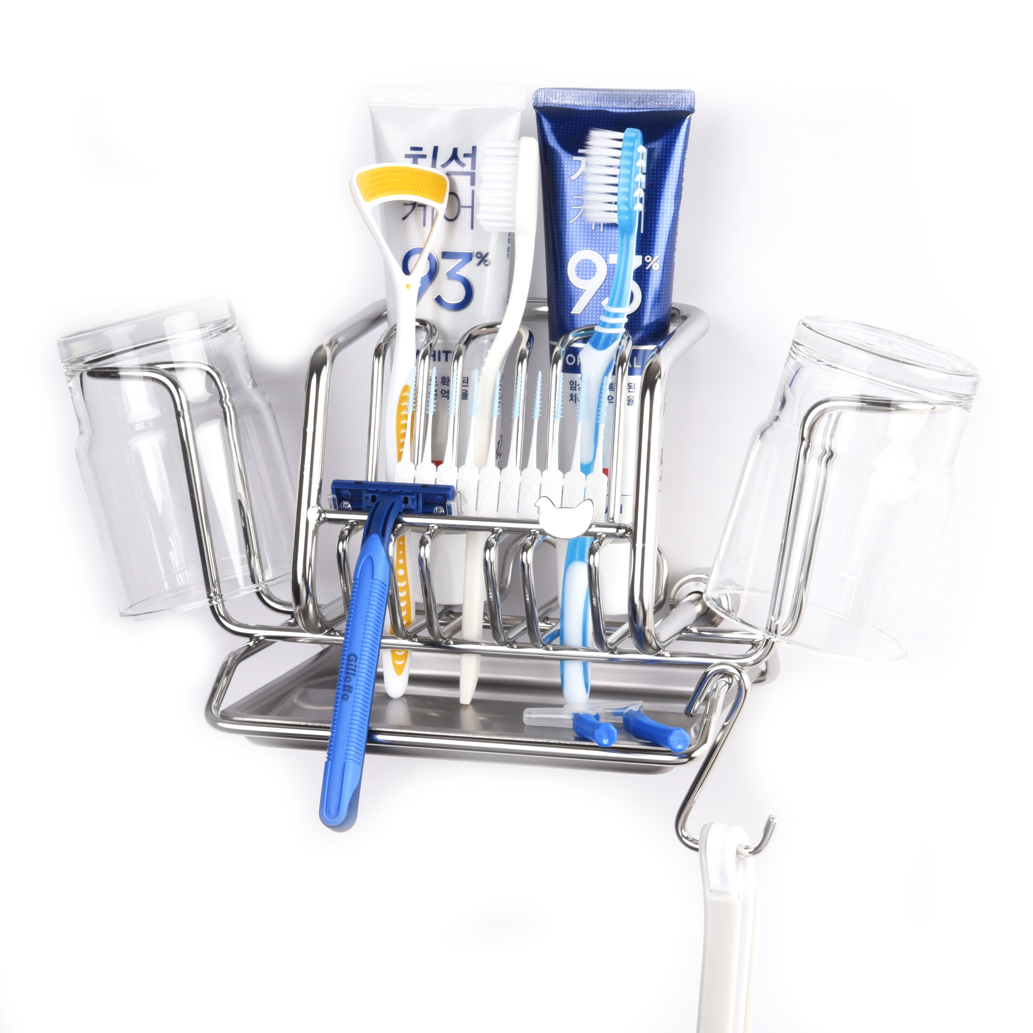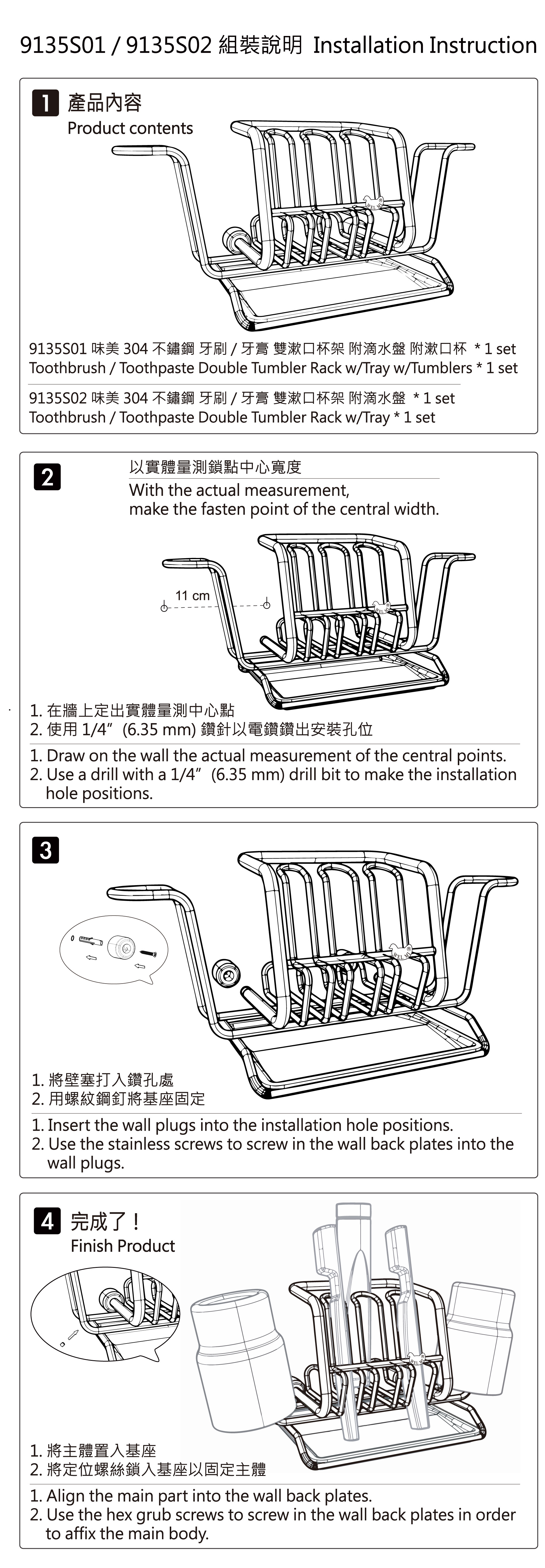 不鏽鋼牙刷 / 牙膏架 * 1 、玻璃漱口杯 * 2 、不鏽鋼滴水盤 * 1 、不鏽鋼接頭 * 2 、不鏽鋼螺絲 * 2 、不鏽鋼固定螺絲 * 2 、塑膠壁塞 * 2 、六角板手 * 1 |