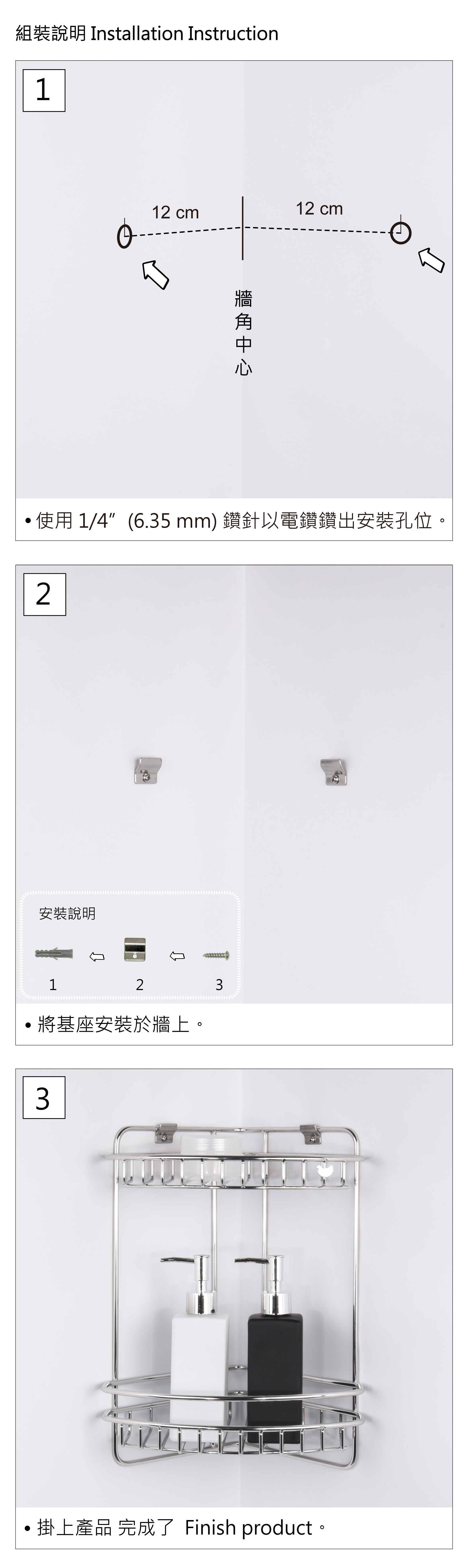| 內部配件: | 不鏽鋼雙層牆角架 (粗線) * 1、不鏽鋼壓片 * 2、不鏽鋼螺絲 * 2、壁塞 * 2 |