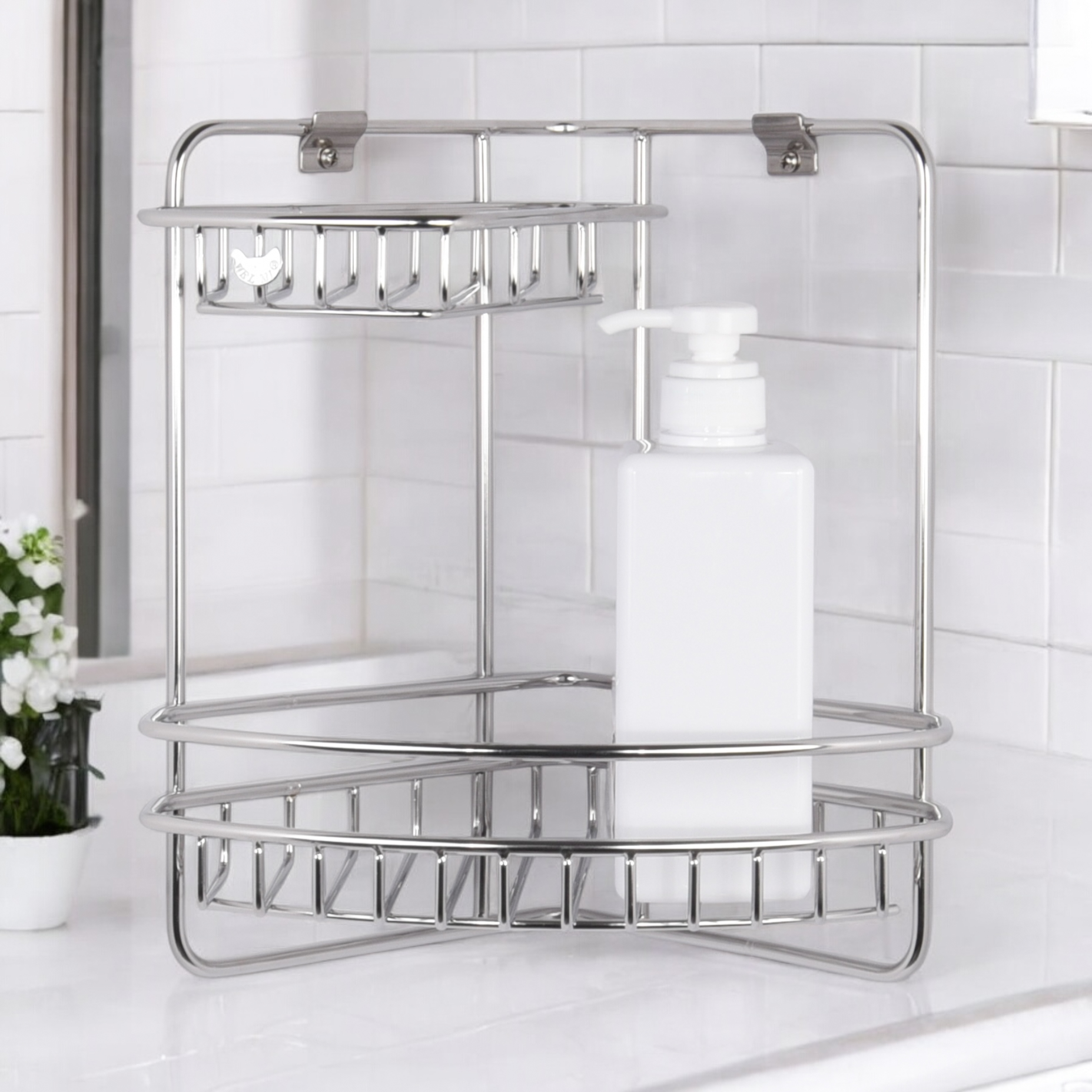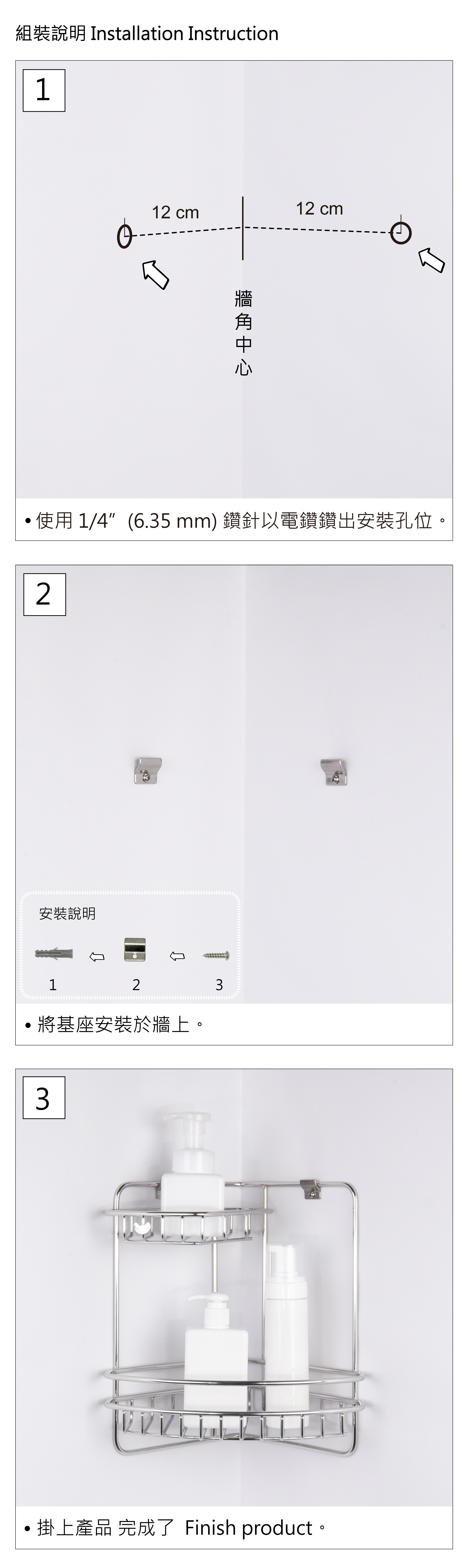 | 內部配件: | 不鏽鋼雙層牆角置物架 * 1 、不鏽鋼壓片 * 2 、不鏽鋼螺絲 *2 、塑膠壁塞 * 2 |